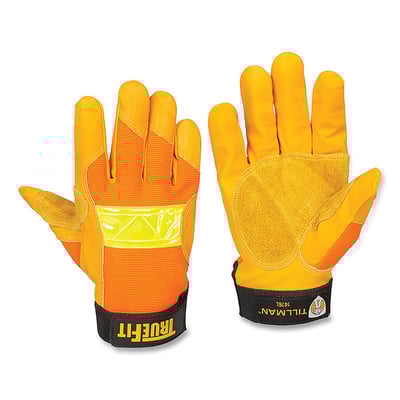 Loading product details...TrueFit® Leather-Palm Gloves, 1476, Top Grain Cowhide/Rough Side Out Cowhide Palm/Spandex BOH, XL, Tan/High Vis Orange